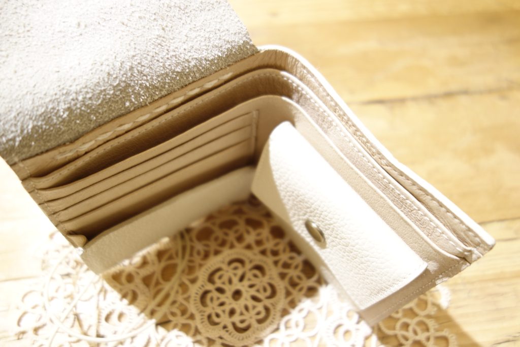 暗い色を選びがちなお財布ですが、コンパクトなデザインは明るめもオススメ。