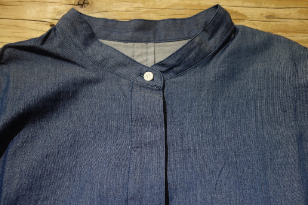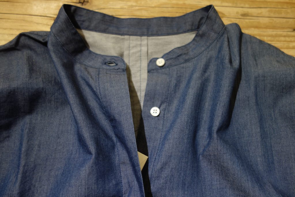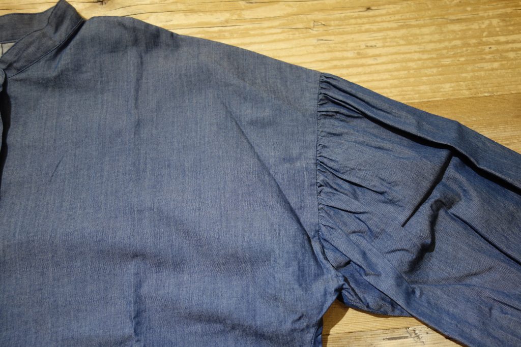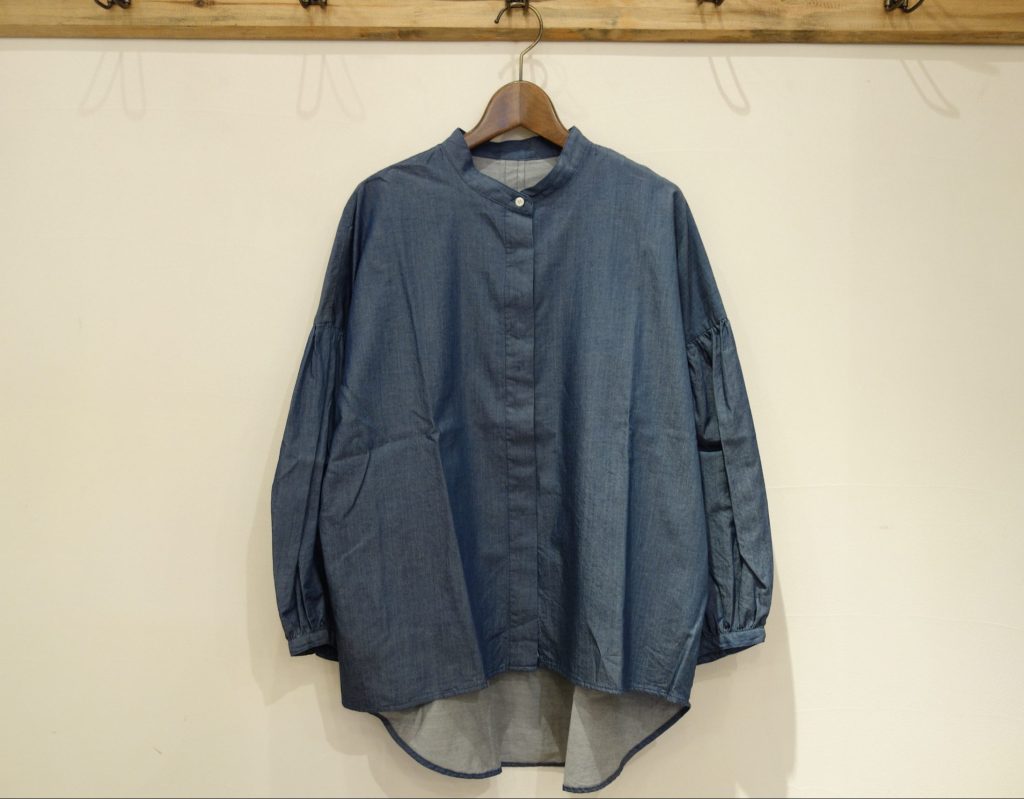 インディゴ硫化ロープ染めツイルスタンドカラードルマンパフスリーブブラウス
