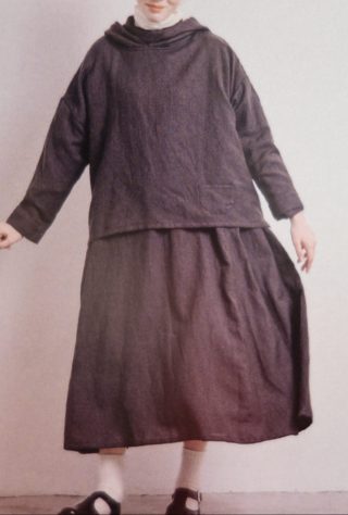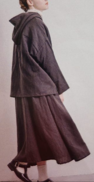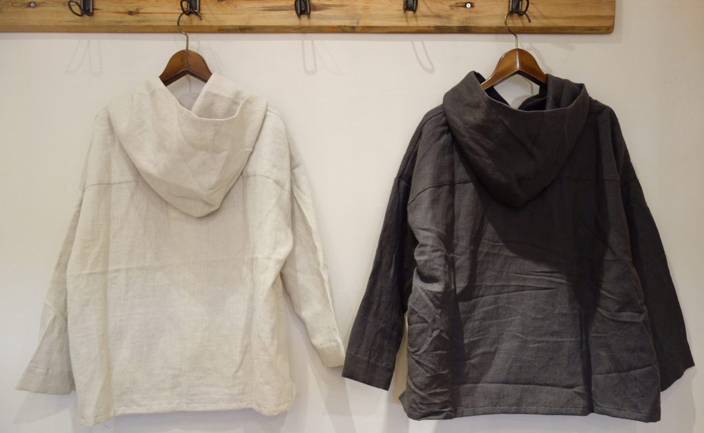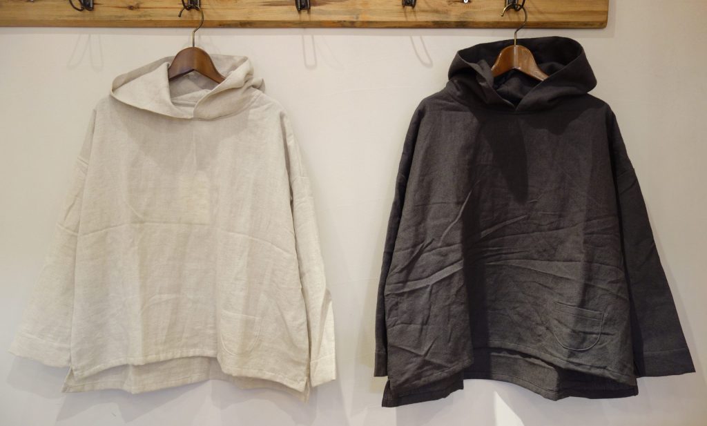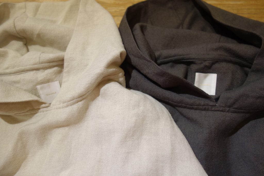 リネン58%、ウール42%の縮絨加工されたマットな質感が良い雰囲気のフードブラウス。