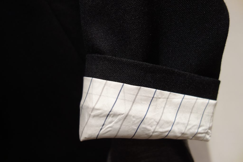クールめなストライプ柄の裏地がステキです。キュプラ素材で袖通りがとても良いです。