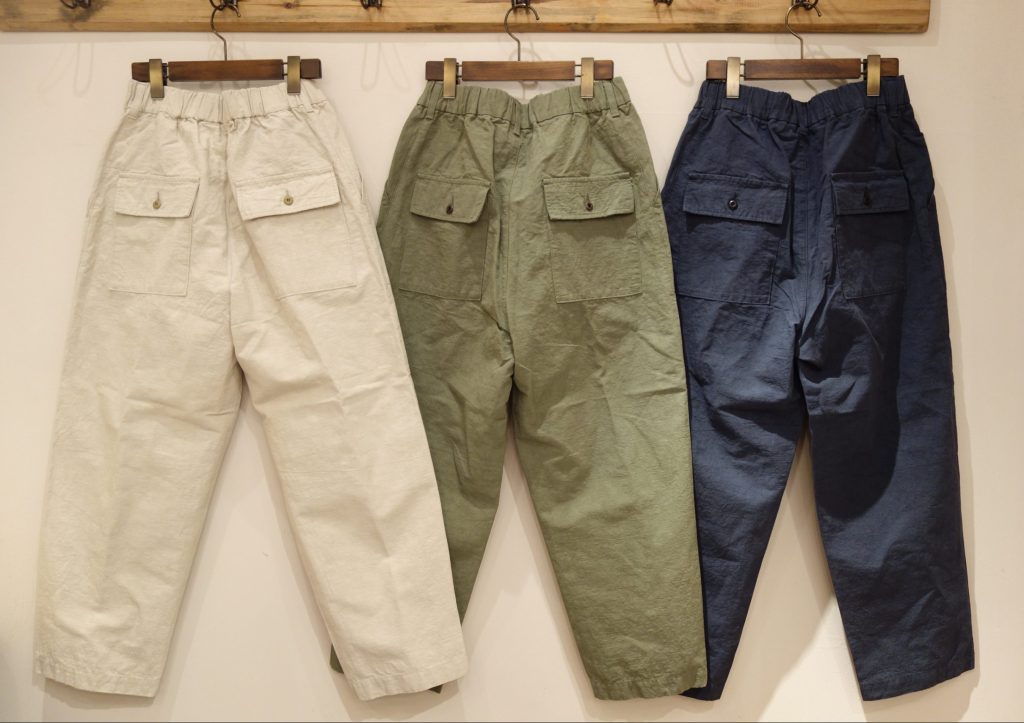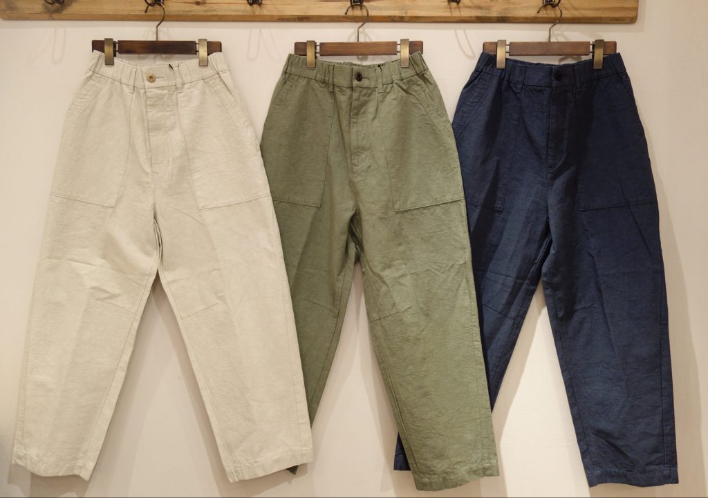 コットン75%、リネン25%の程よいハリ感が快適なワークパンツ。