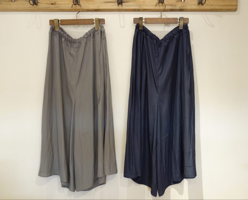 落ち感のあるさらりとしたポリエステル素材がとっても良い感じのキュロットパンツ。