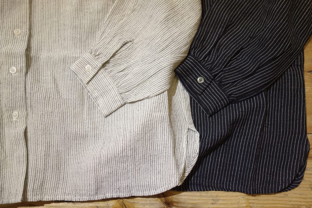ウールリネン混合の軽くてドライタッチな素材感がステキなストライプシャツ。